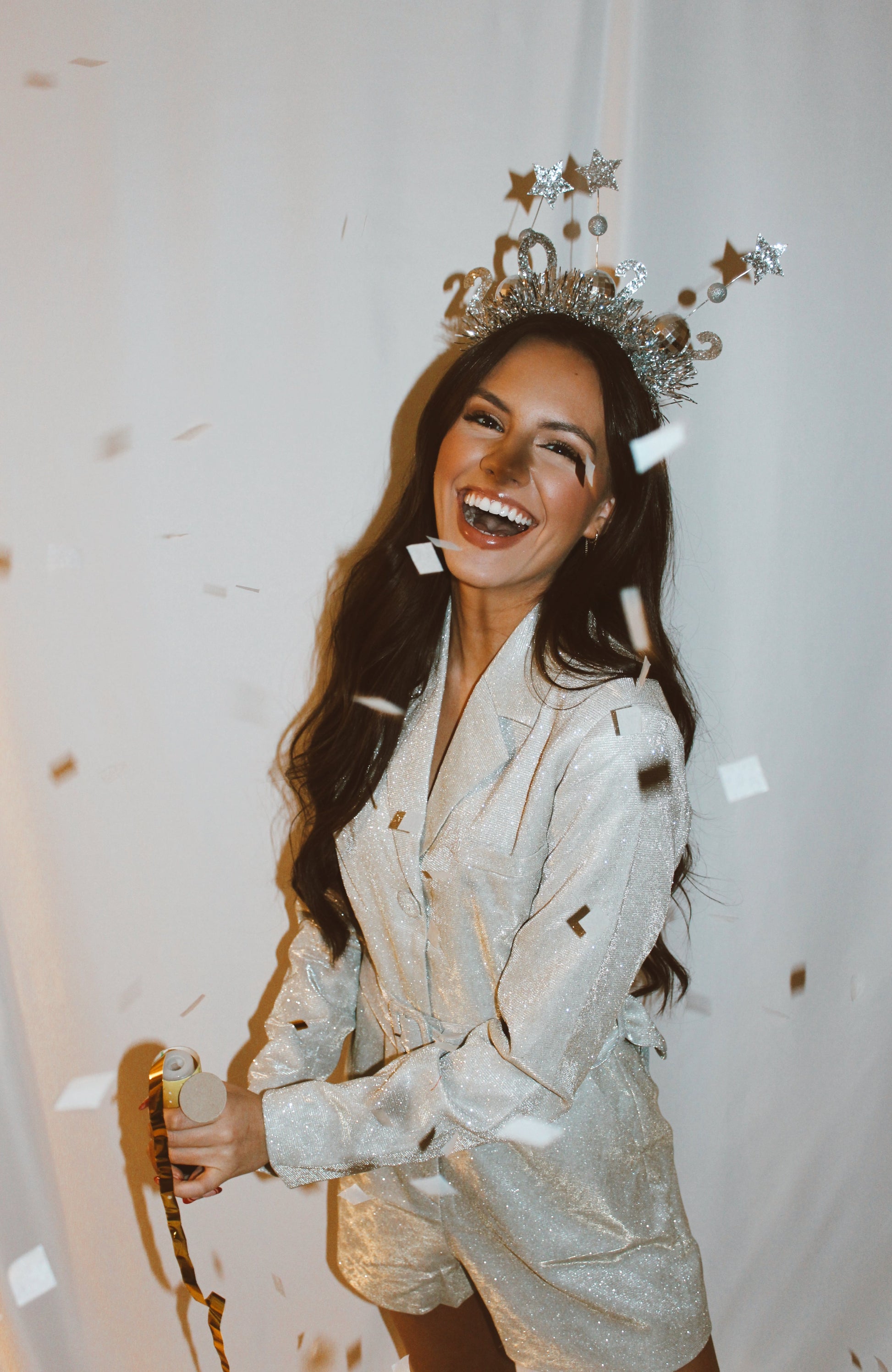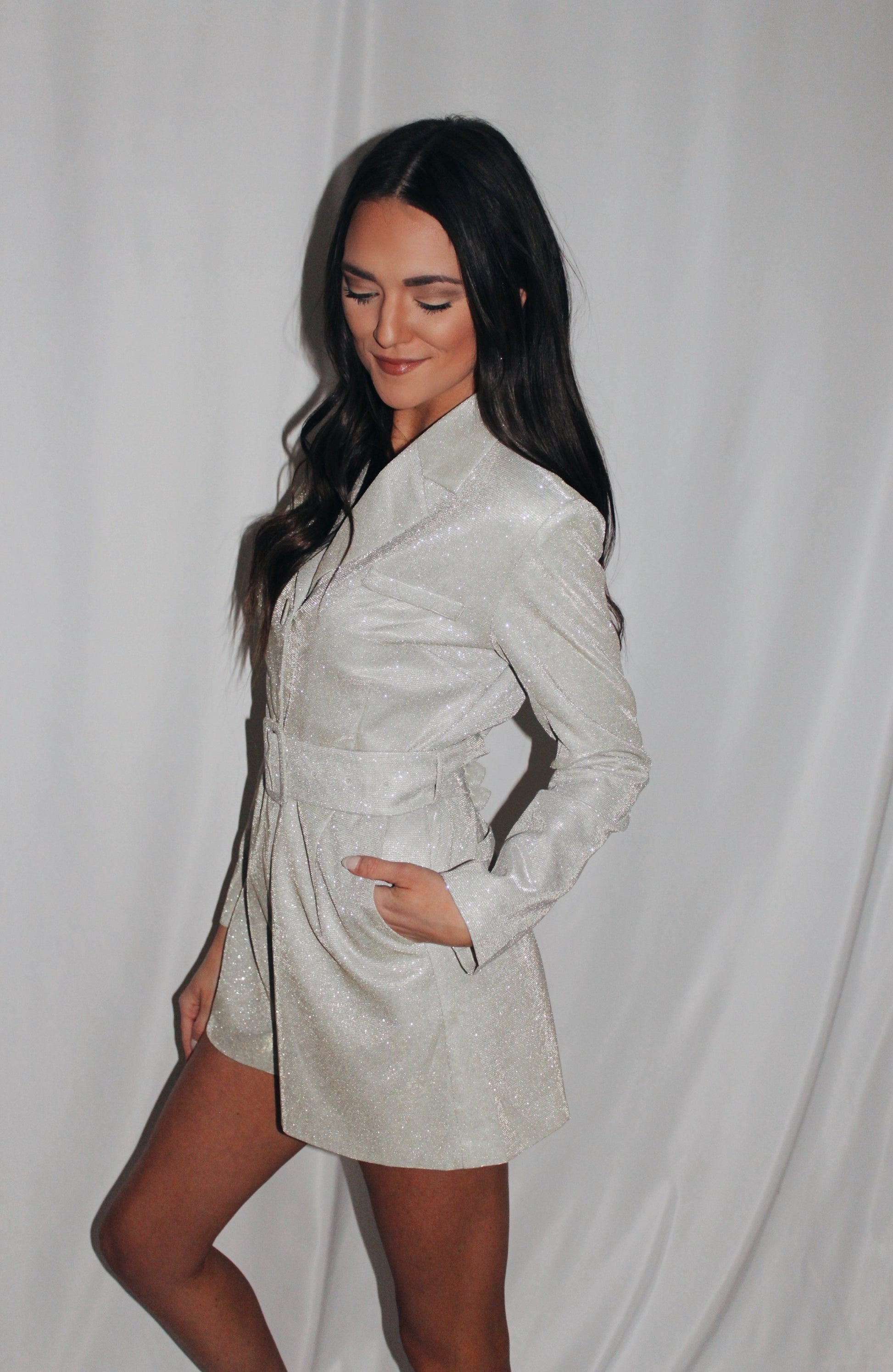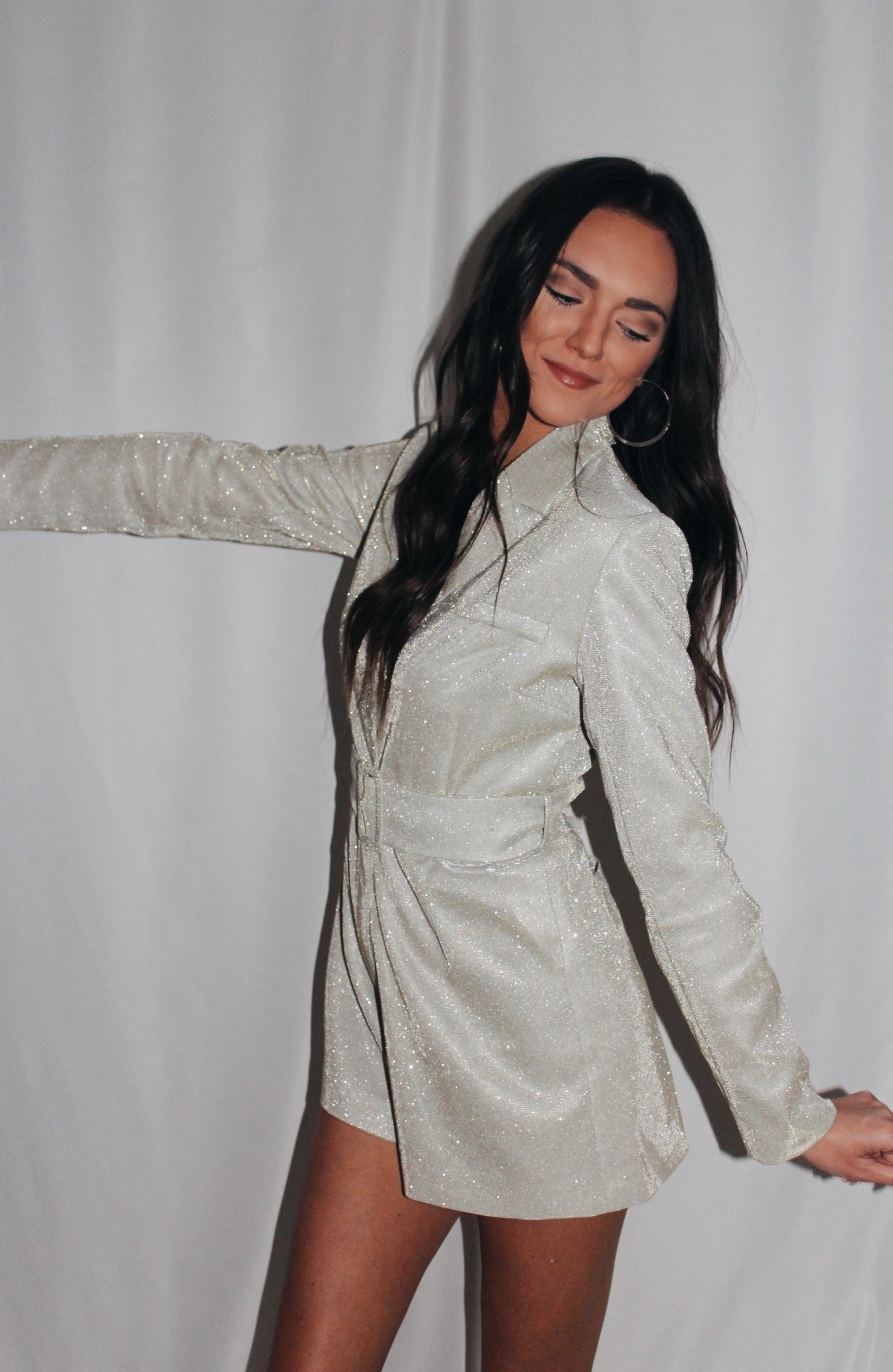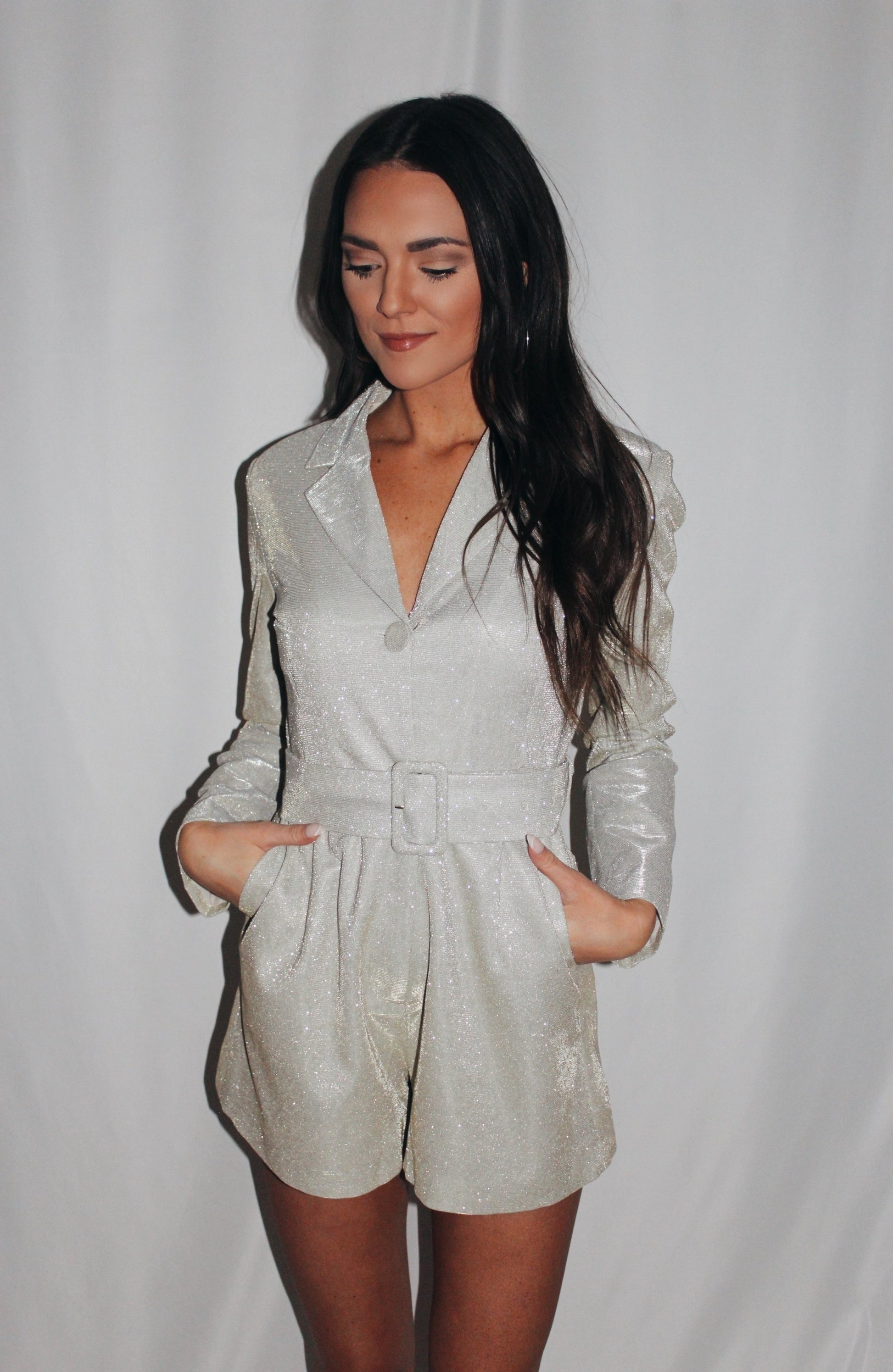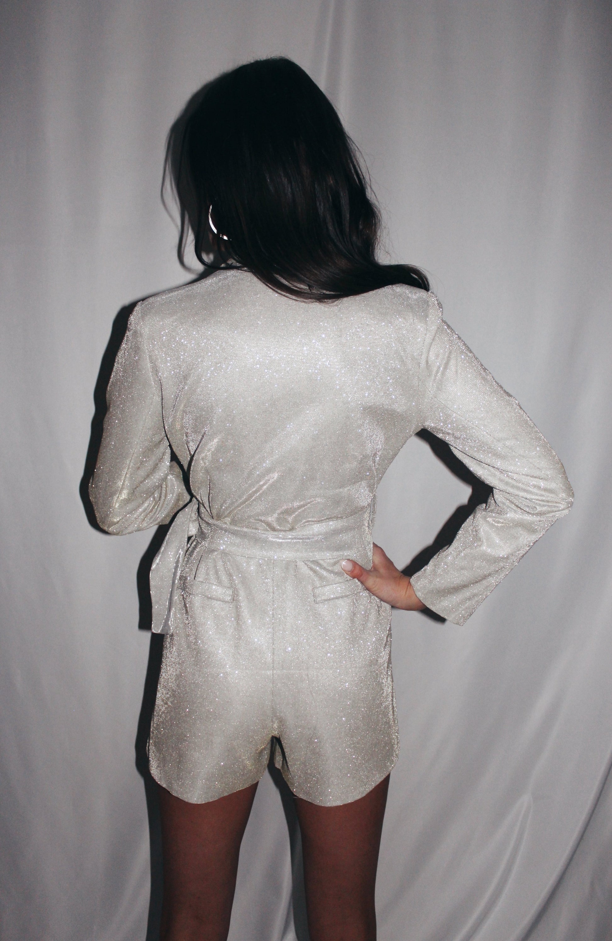 Long sleeve blazer style romper in silver glitter fabric. **UK sizing: XS= US small, S= US medium, M= US large. **